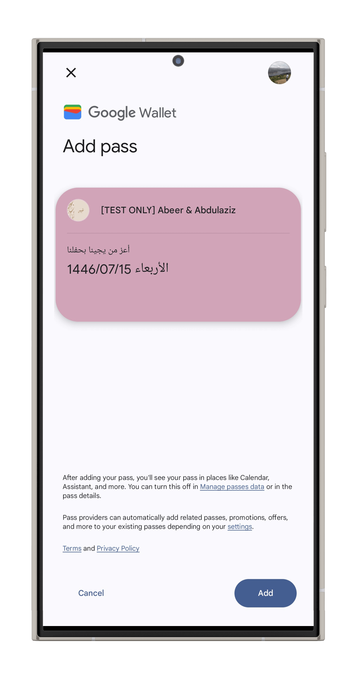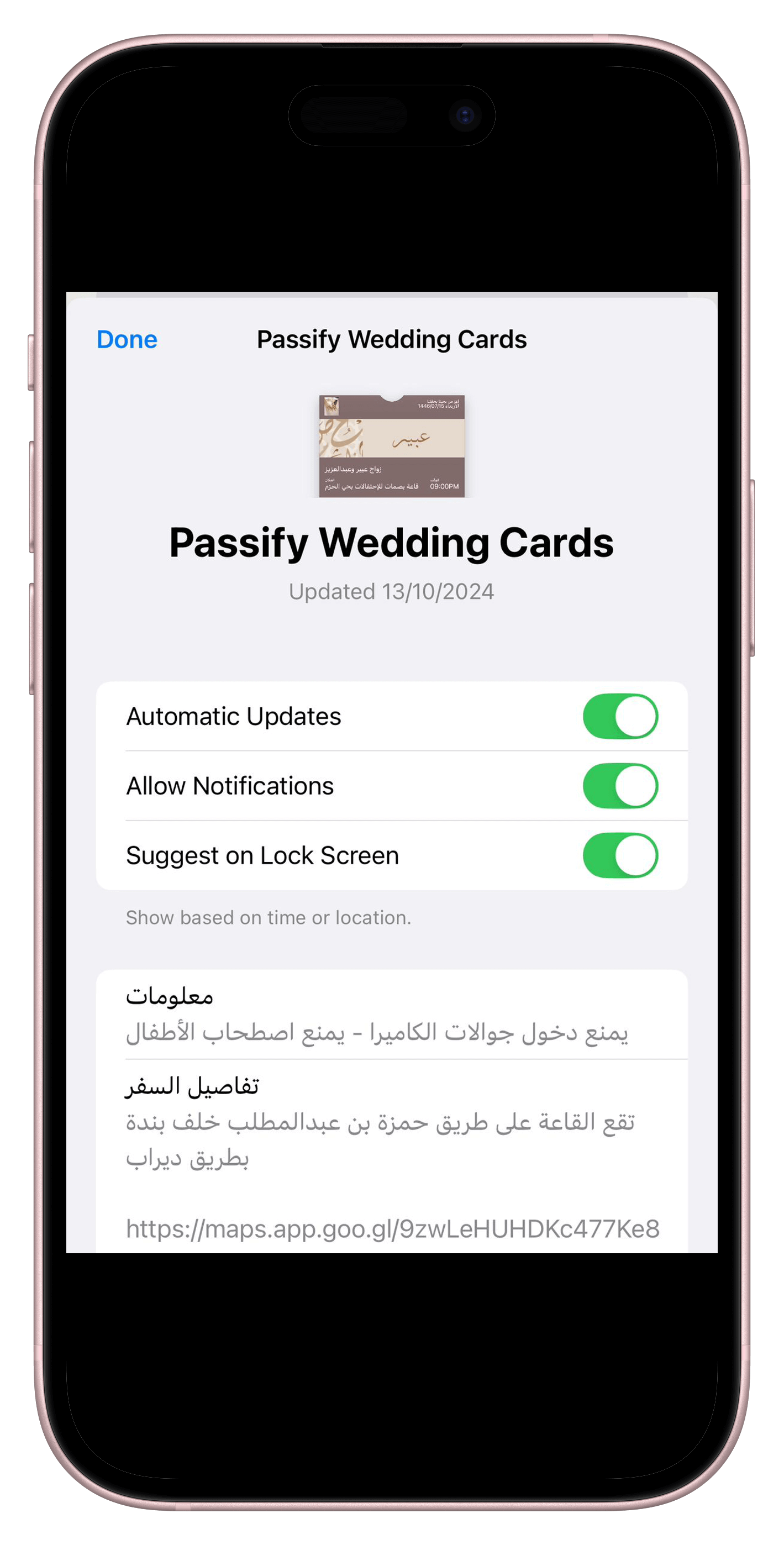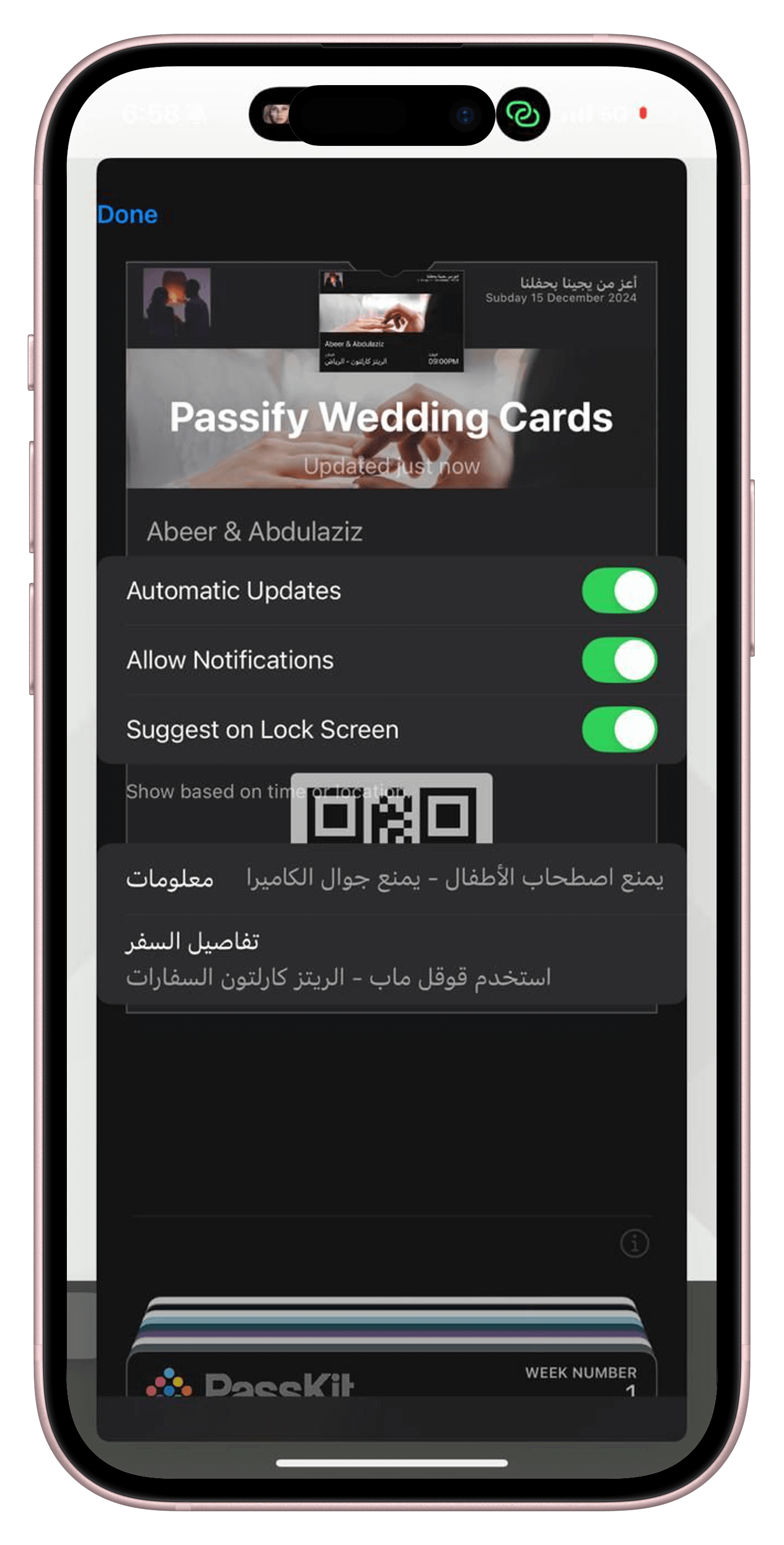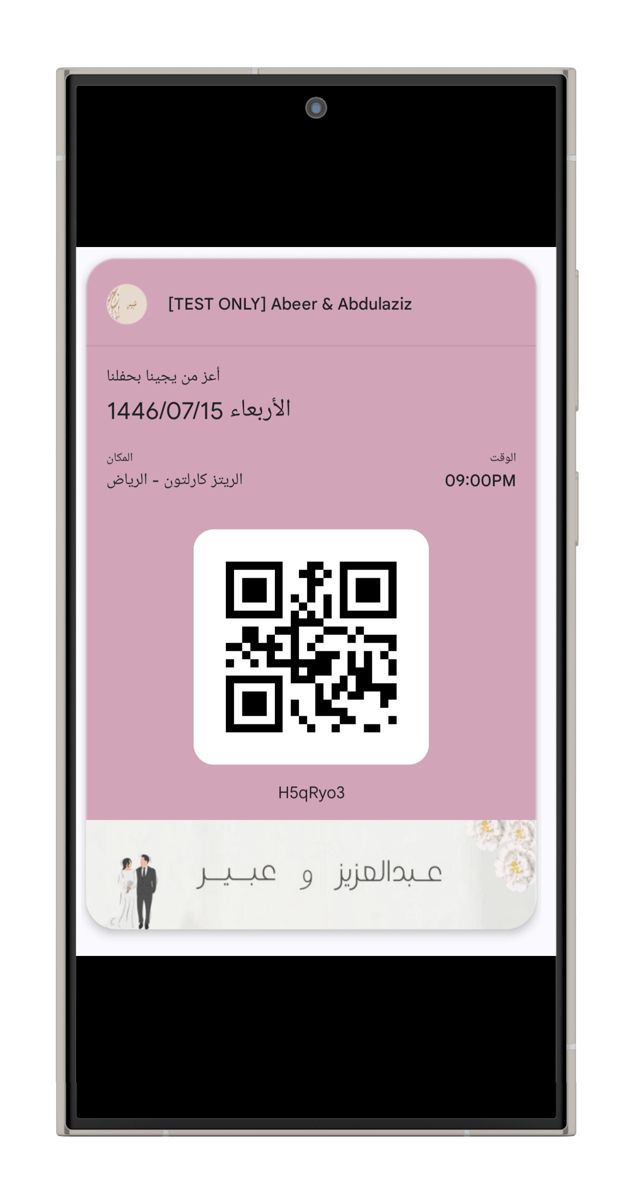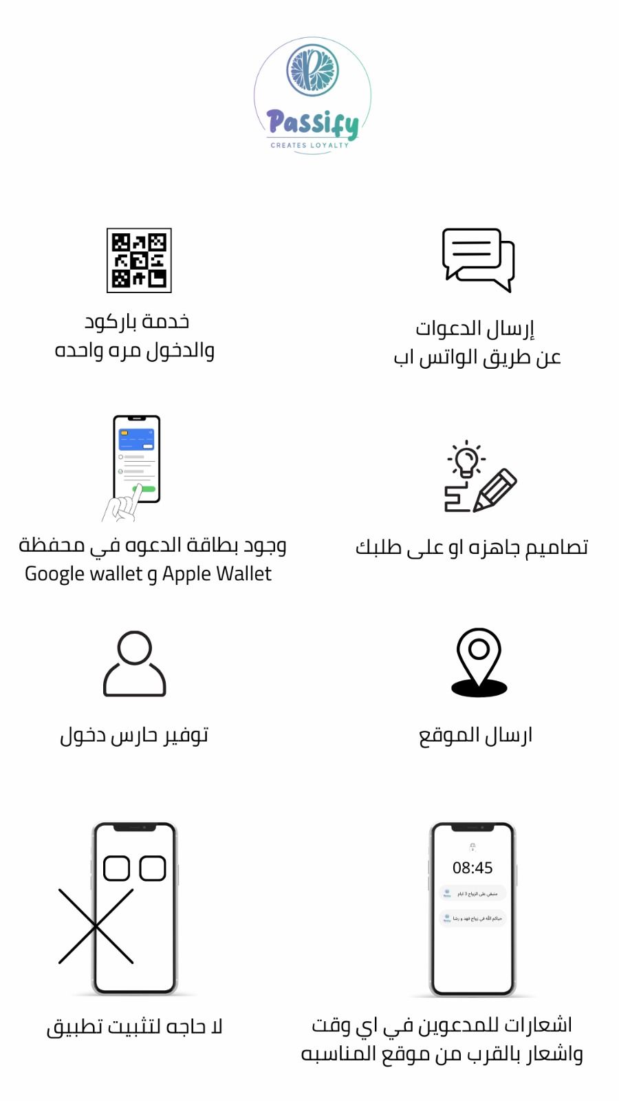 باسيفاي تفعيل فوري لتنظيم دخول زواجك أو حفلك المميز، حلك الأمثل لدعوات الزواج والحفلات بشكل مميز ومبتكر (كلاس من الآخر). بأسلوب أنيق ومبسط، نقدم لك دعوات زفاف/ حفلات تُحفظ بسهولة في المحفظة الرقمية المتوافقه مع Google Pay و Apple Wallet , مما يسهل الوصول إليها ويضمن تجربة مميزة لضيوفك. مع باسيفاي، تتحول دعوات الزفاف والحفلات إلى لمسة من الأناقة الرقمية. اطلبها الأن